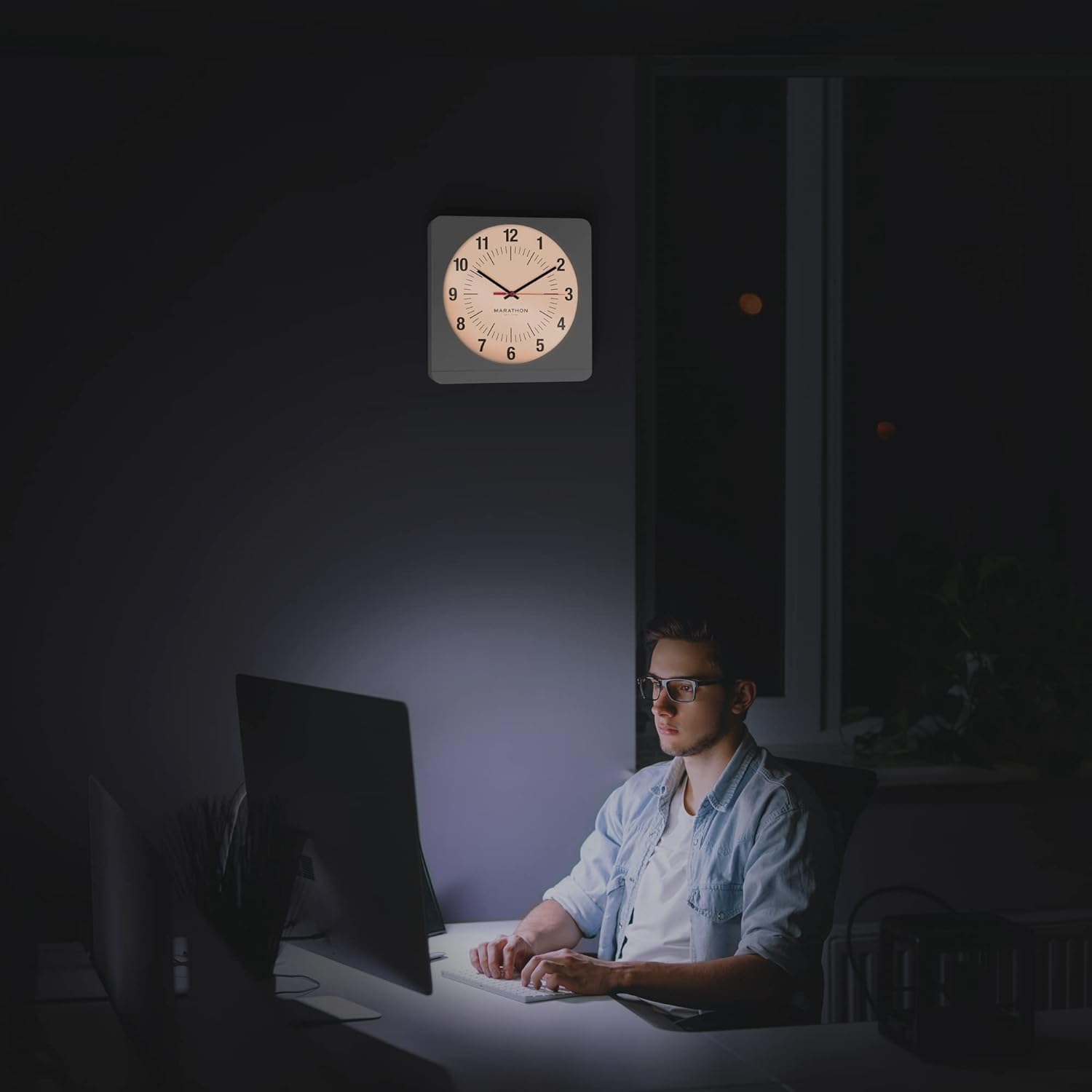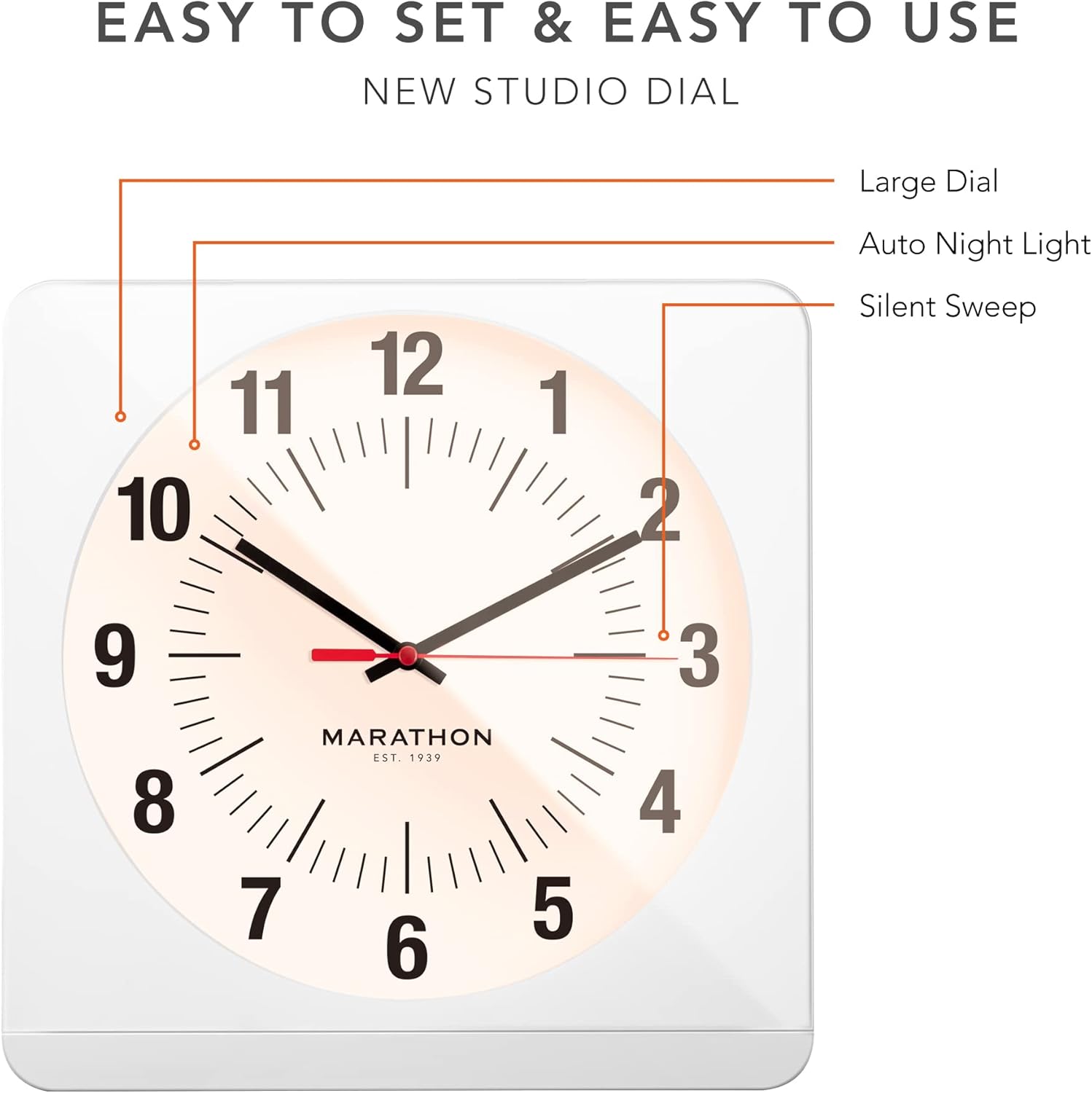 Marathon Klassische, geräuschlose, Nicht tickende Wanduhr, 30,5 cm, quadratische Wanduhr, leicht zu lesen, warmes Bernstein, automatische Hintergrundbeleuchtung, Elegante Kaminuhr