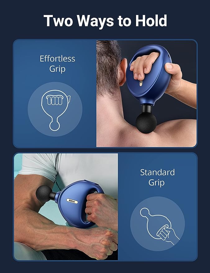Zwei Haltemöglichkeiten: Der ergonomische Griff bietet eine bequeme Möglichkeit zum Halten und Steuern auf zwei verschiedene Arten; Verwenden Sie den Standardgriff, um schwer zugängliche Bereiche wie Ihre Knöchel und Ihren Rücken zu massieren, oder den mühelosen Griff für eine gezieltere Massage