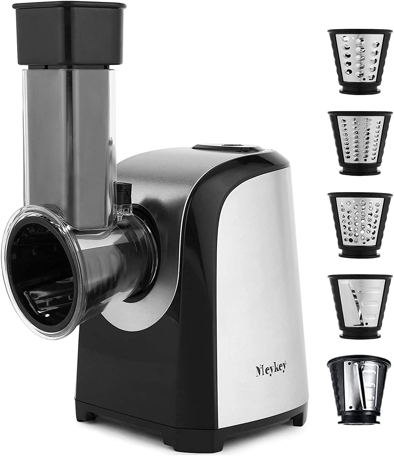 Meykey Elektrischer Gemüse- und Obstschneider, 150 W, mit 5 Zubehörteilen und großem Futterrohr, für Ihr Gemüse und Obst, BPA-frei