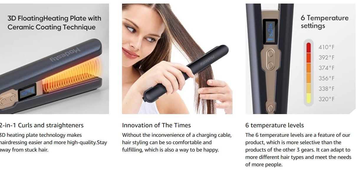 MODESTY 2-in-1 Kabelloser Haarglätter und Lockenwickler mit 9600 mAh großem Akku, Verbrühschutz, 6-stufige