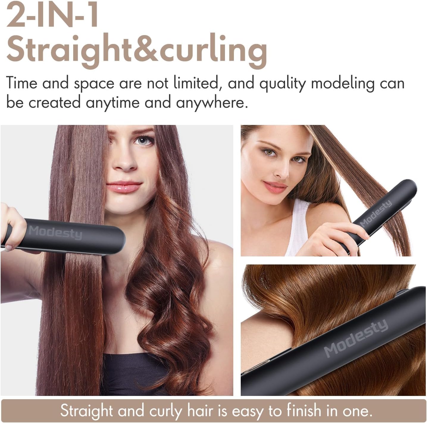 MODESTY 2-in-1 Kabelloser Haarglätter und Lockenwickler, schnurloser Reise-Flacheisen, wiederaufladbarer Titanplatte, tragbarer Lockenstab mit 9600 mAh großem Akku, Verbrühschutz, 6-stufige