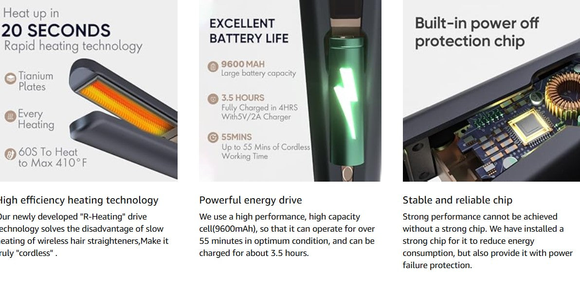 【Hocheffiziente Heiztechnologie】Erleben Sie den Komfort unserer neu entwickelten "R-Heating" Antriebstechnologie in unserem kabellosen Haarglätter. Verabschieden Sie sich von langsamer Erwärmung mit unserer ultraschnellen Heizung, die mit der von kabelgebundenen Haarglättern vergleichbar ist. Genießen Sie das Styling jederzeit und überall ohne Wartezeit.