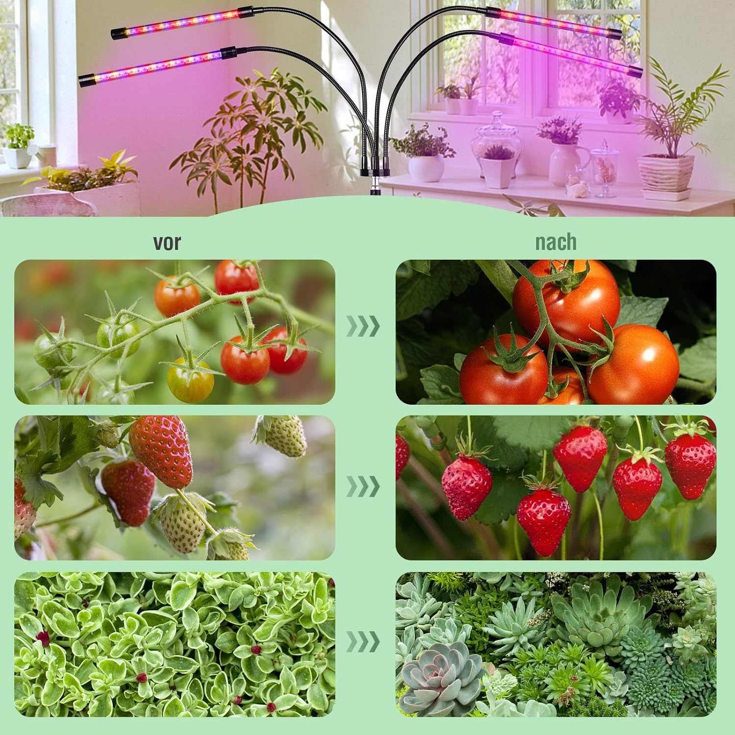 • ????【4 BELEUCHTUNGSMODI UND 0-100% DIMMBARE STUFEN】Mit 4 Modi (wie natürliches Sonnenlicht) können Sie 1/2/3/4Lichtbalken und 6 Helligkeiten zwischen 10% und 100% aktivieren. Sie können die Helligkeit an die Bedürfnisse der verschiedenen Pflanzen anpassen, um die Unzulänglichkeit des natürlichen Sonnenlichts effektiv auszugleichen.