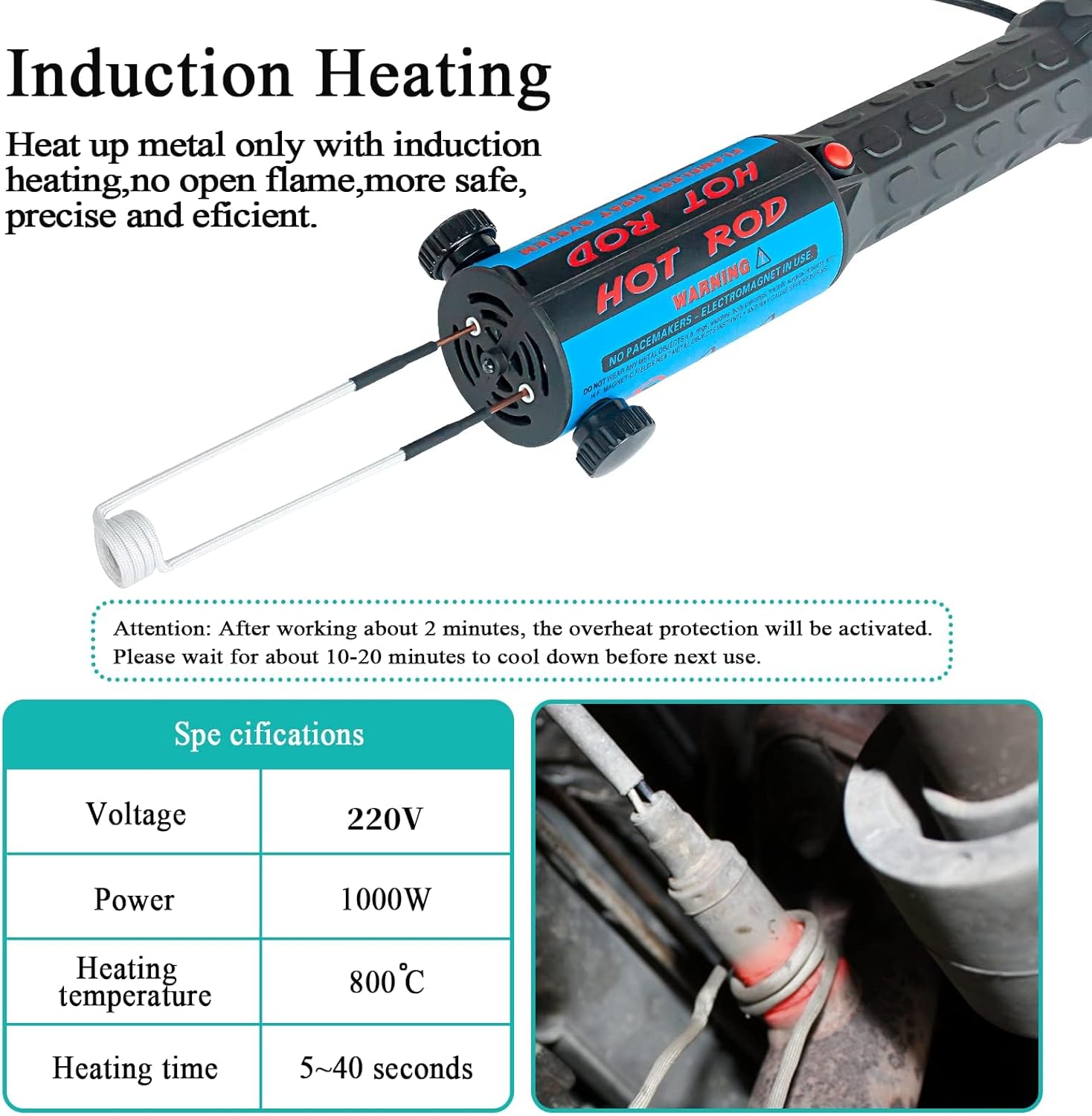 [Alevsiz Isıtma] İndüksiyon ısıtıcı, metalleri ısıtmak için elektromanyetik alanlar kullanır, böylece saplamaları ısıtıp genişleterek saplamaların hızlı bir şekilde çıkarılmasını ve çalışma performansınızın artırılmasını sağlar. Isıtma sırasında açık alev oluşmaz ve güvenli bir çalışma ortamı sağlar.