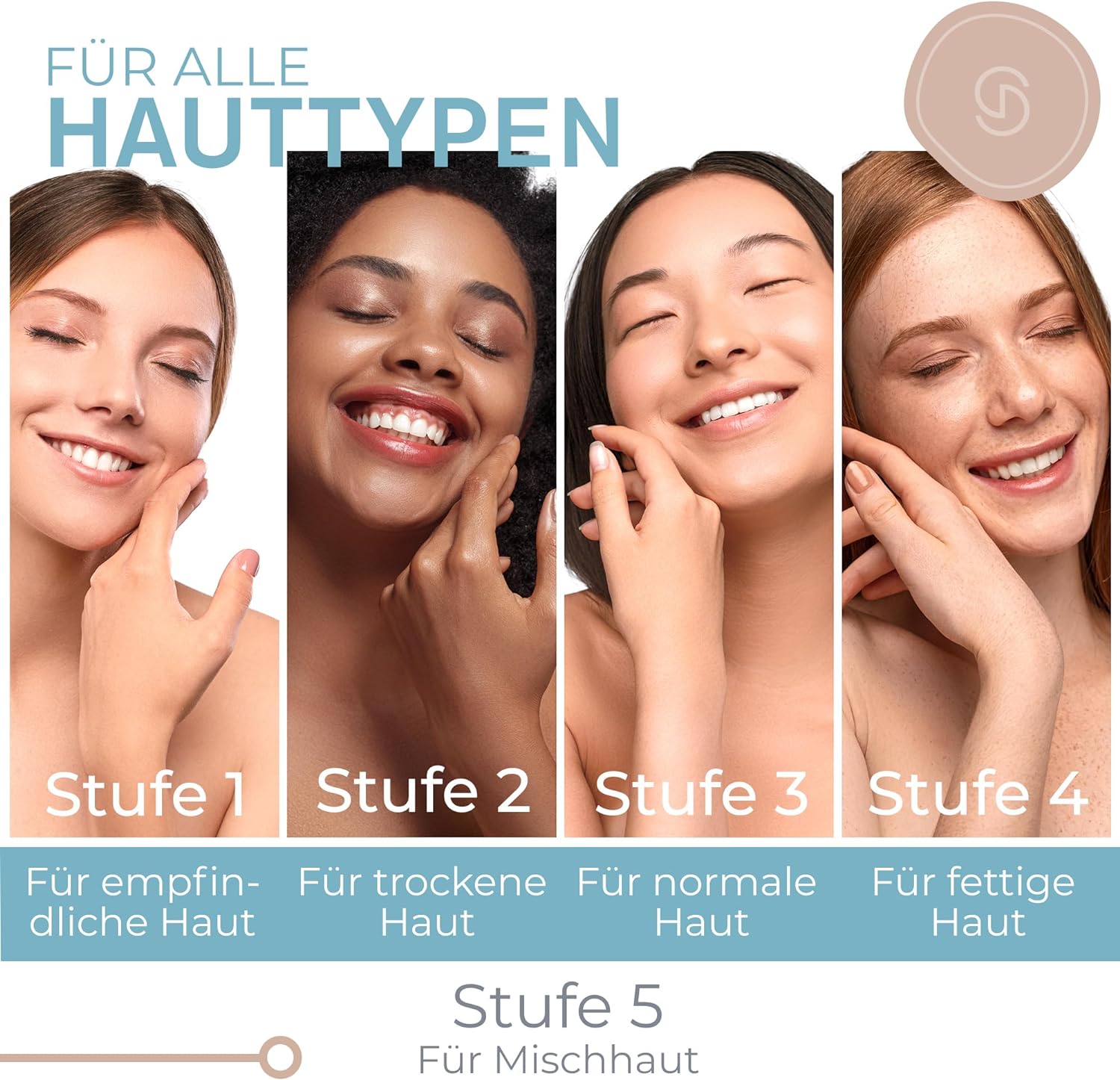 5 einstellbare Saugstufen – Die Saugkraft dieses Porenreiniger-Saug- und Mitesserentferners kann je nach Hauttyp angepasst werden: Gesichtsreinigung von empfindlicher Haut, trockener Haut, natürlicher Haut, fettiger Haut und Mischhaut.