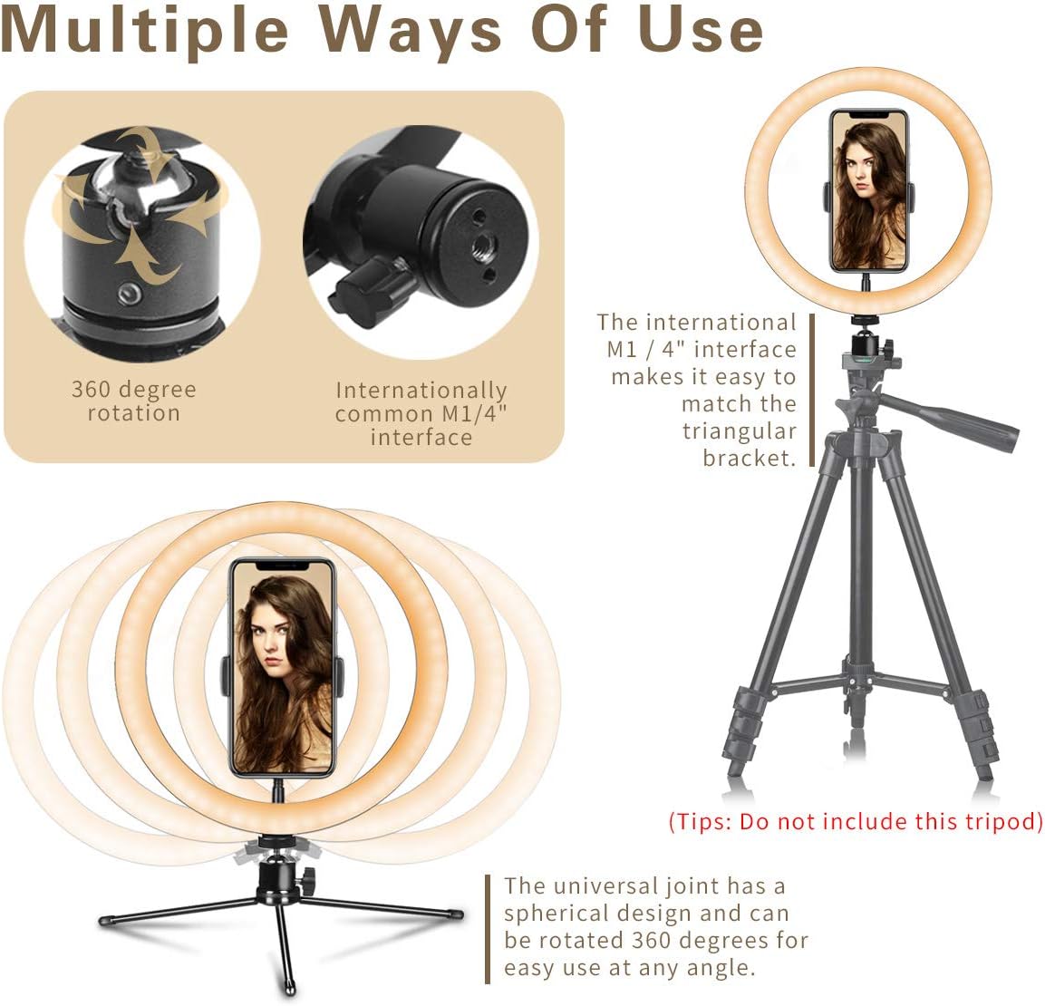 【Ringlicht mit Ständer】 Dieses 10-Zoll-Ringlicht wird mit einem Metallstativständer und einem Handyhalter geliefert. Die um 360 Grad drehbare kreisförmige Wolkenplattform kann frei an jeden Winkel angepasst werden. Es ist das ideale Ringlicht für Streaming, Fotobeleuchtung, Make-up, Smartphone, YouTube-Videoaufnahmen und so weiter.