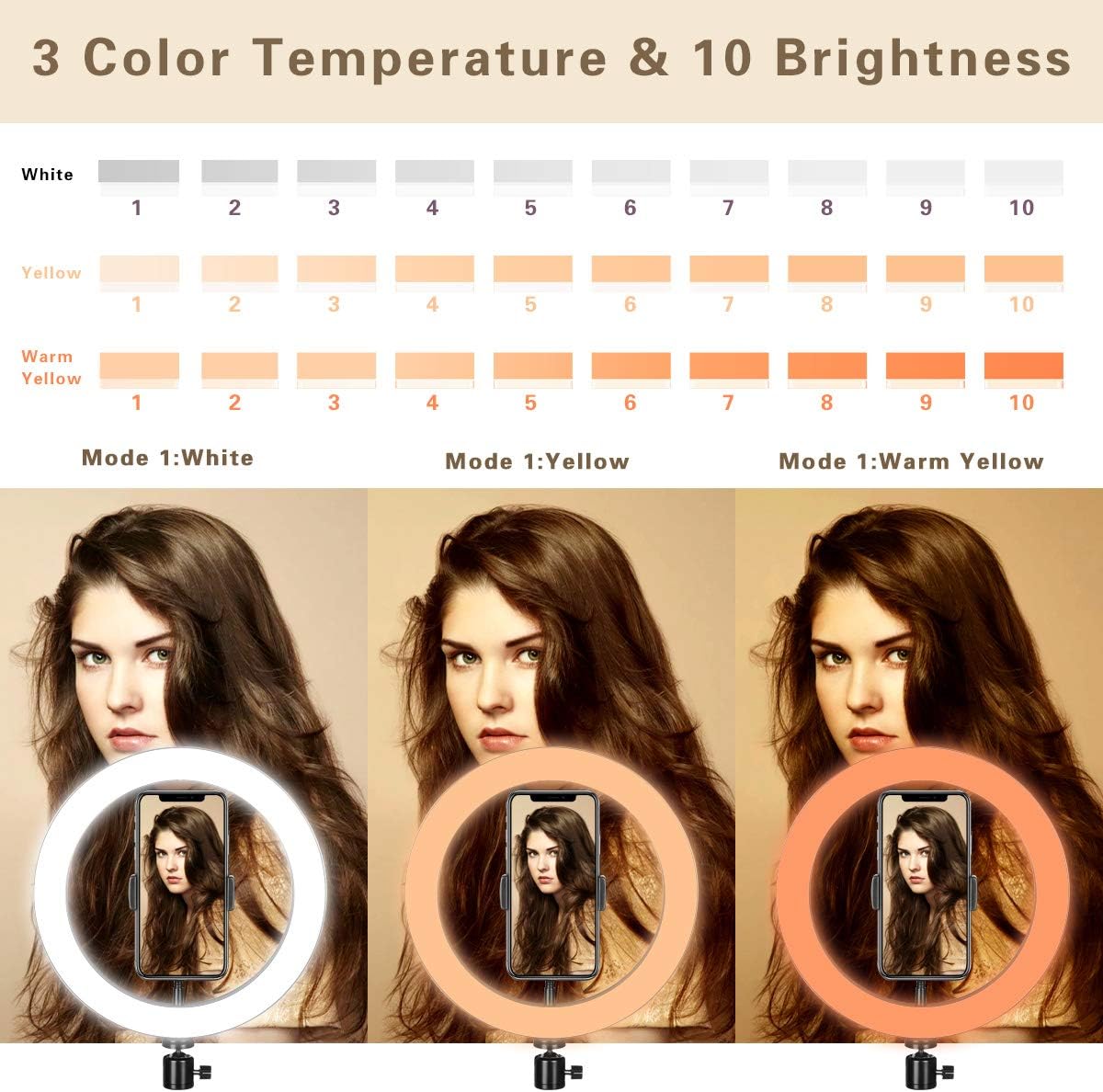 【Dimmbares Ringlicht】 3-Farben-Lichtmodus: Weiß, warmes Gelb und warmes Weiß. Jeder Beleuchtungsmodus verfügt über 10 einstellbare Helligkeiten und kann Ihren unterschiedlichen Anforderungen gerecht werden