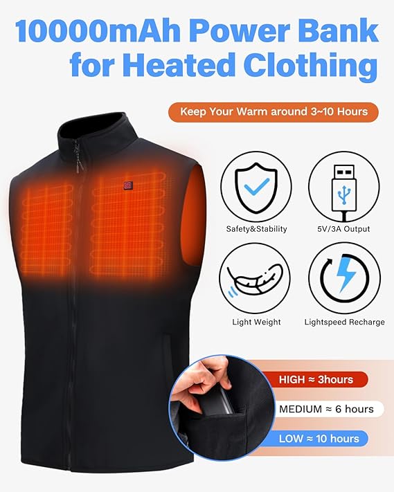 10000 mAh Akku-Pack - Bei der niedrigsten Temperatureinstellung bietet der hintere Bereich 11 Stunden Heizung, der vordere Bereich bietet 15 Stunden, und die Aktivierung von Vorder- und Rückseite bietet 7 Stunden kontinuierliche Wärme. Während des Gebrauchs muss der Akku die ganze Zeit angeschlossen werden und kann nicht getrennt werden. Die Trennung stoppt die Heizung. Die Powerbank kann auch verwendet werden, um Ihr Handy oder andere elektronische Geräte aufzuladen.