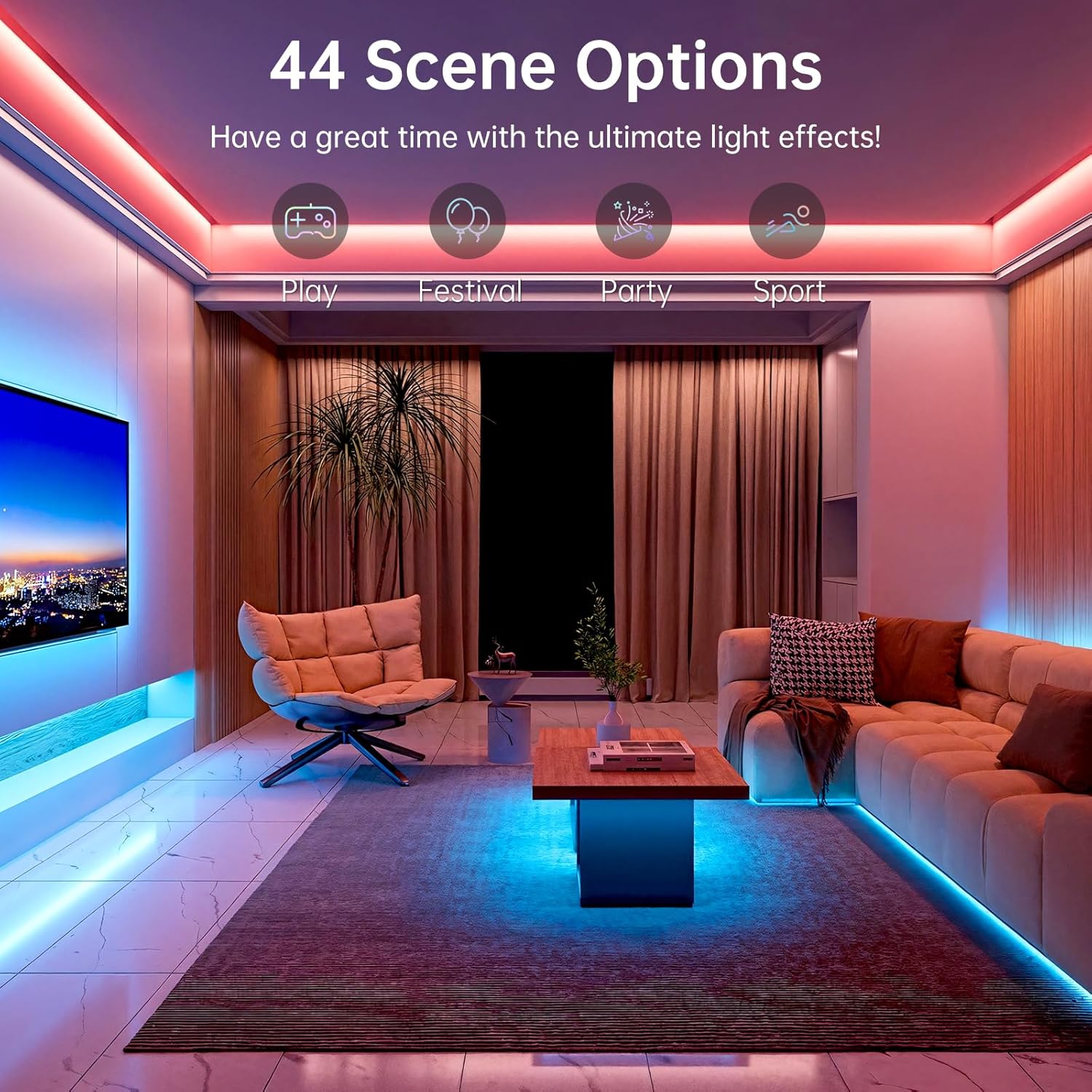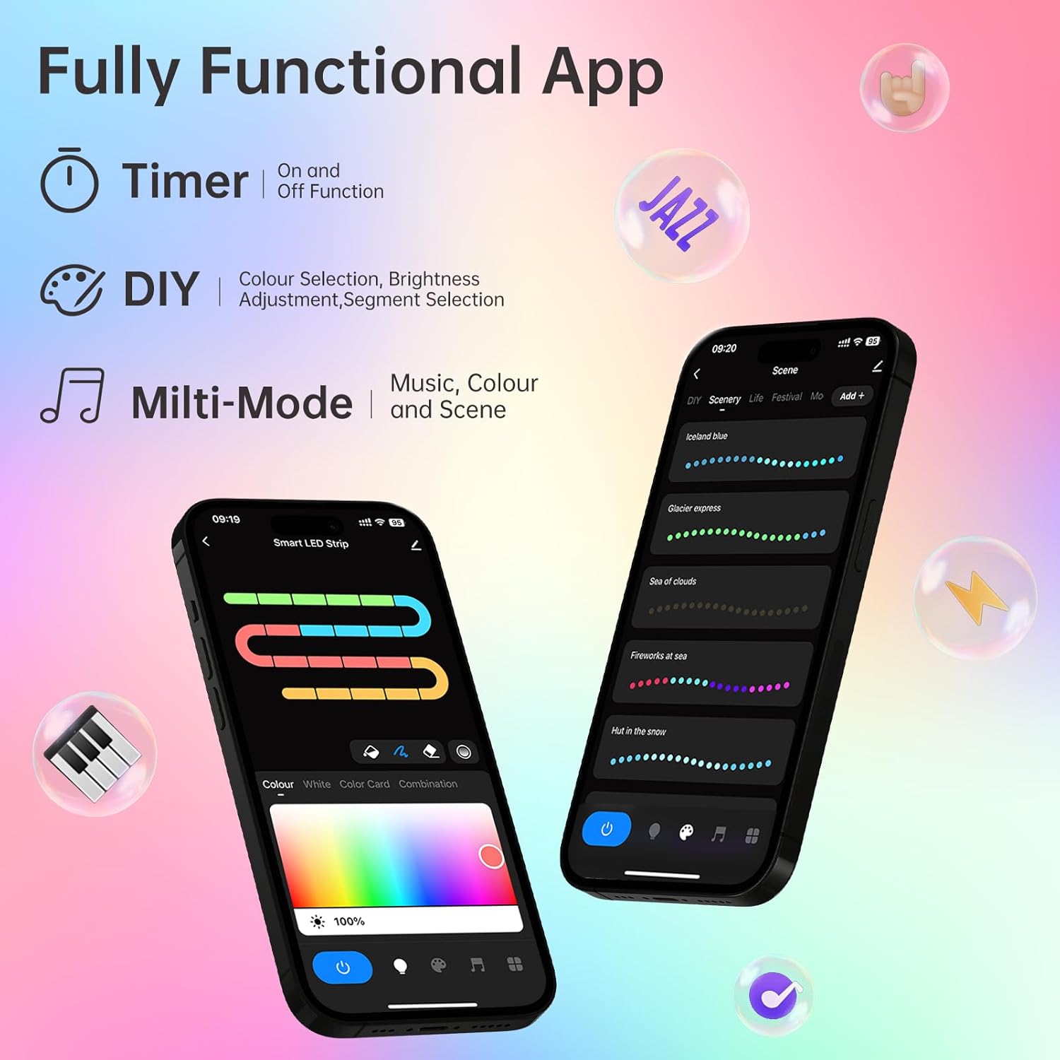 Musiksynchronisierter LED Strip - Der LED Strip 10m verfügt über ein eingebautes empfindliches Mikrofon.Der LED Streifen kann die Musik im Mobiltelefon und die Geräusche der Umgebung erkennen.Das RGB LED-Licht kann Farbe,Helligkeit und Rhythmus je nach Musik oder Umgebungsrhythmus ändern.LED Lichterkette sind das ideale Accessoire für Partys.Wenn Sie gerne singen und spielen,synchronisiert der LED Band die Lichter auch entsprechend den Umgebungsgeräuschen und macht Ihre Musik farbenfroh