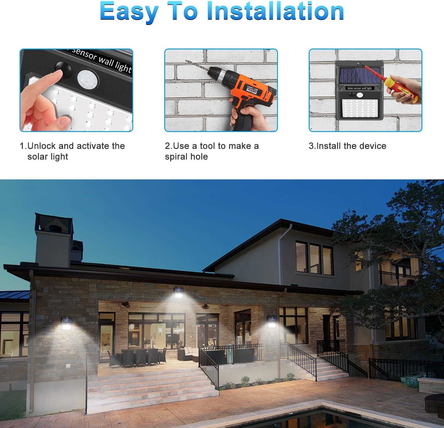 【Wasserdicht IP65 und langlebiges Licht】 Wasserdichtigkeitskoeffizient IP65, die professionelle wasserdichte Solarlampe IP65 arbeitet sehr hell. Selbst an regnerischen Tagen kann es Ihren Garten, Hof, Garage, Einfahrten, Haustüren, Hinterhöfe, Wände usw. beleuchten.