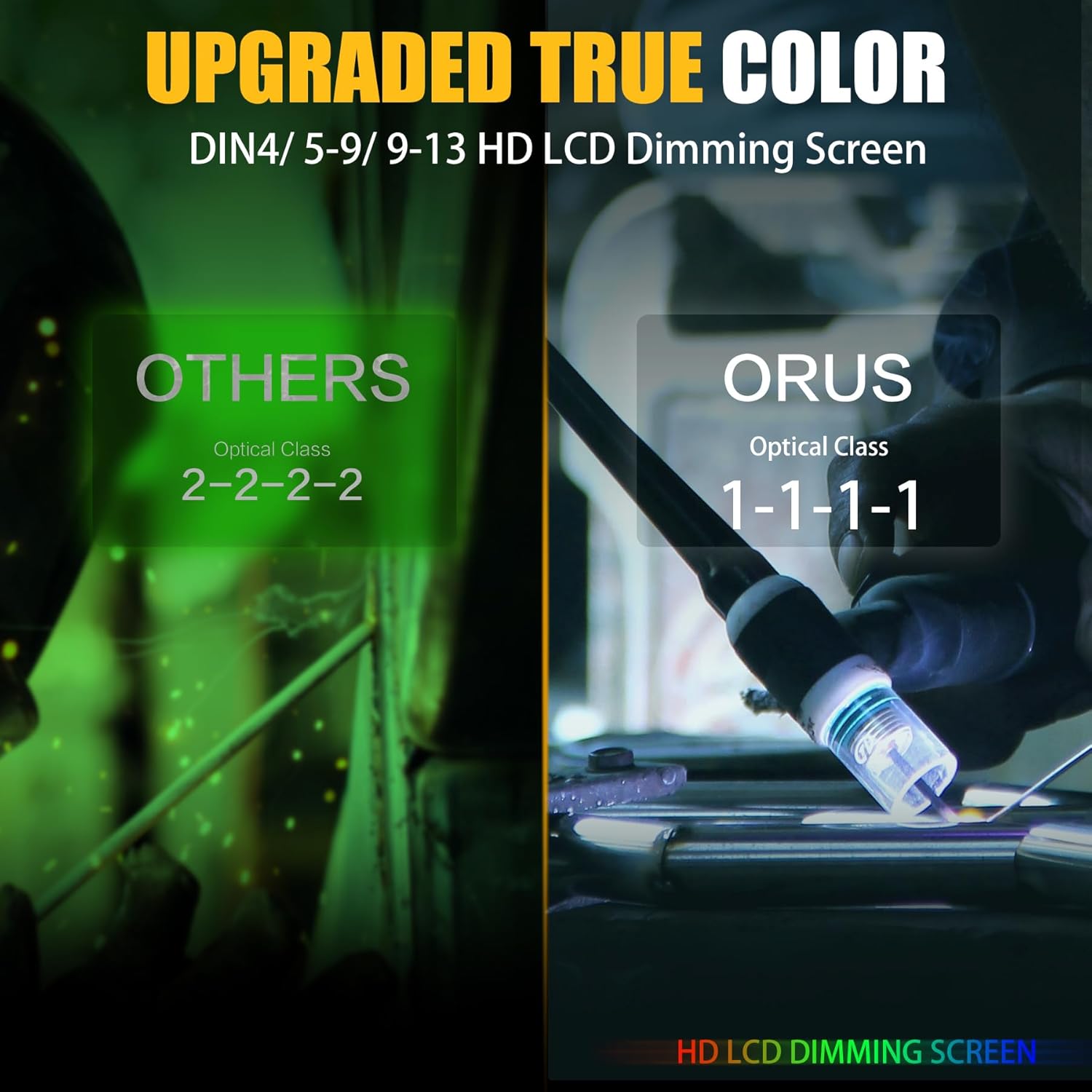Beeindruckend großes, dimmbares HD-Display: Maximales Sichtfeld von 10 x 9,3 cm! Optische Klarheit von 1/1/1/1 für optimale Sicht und verbesserte Schweißtechnik.