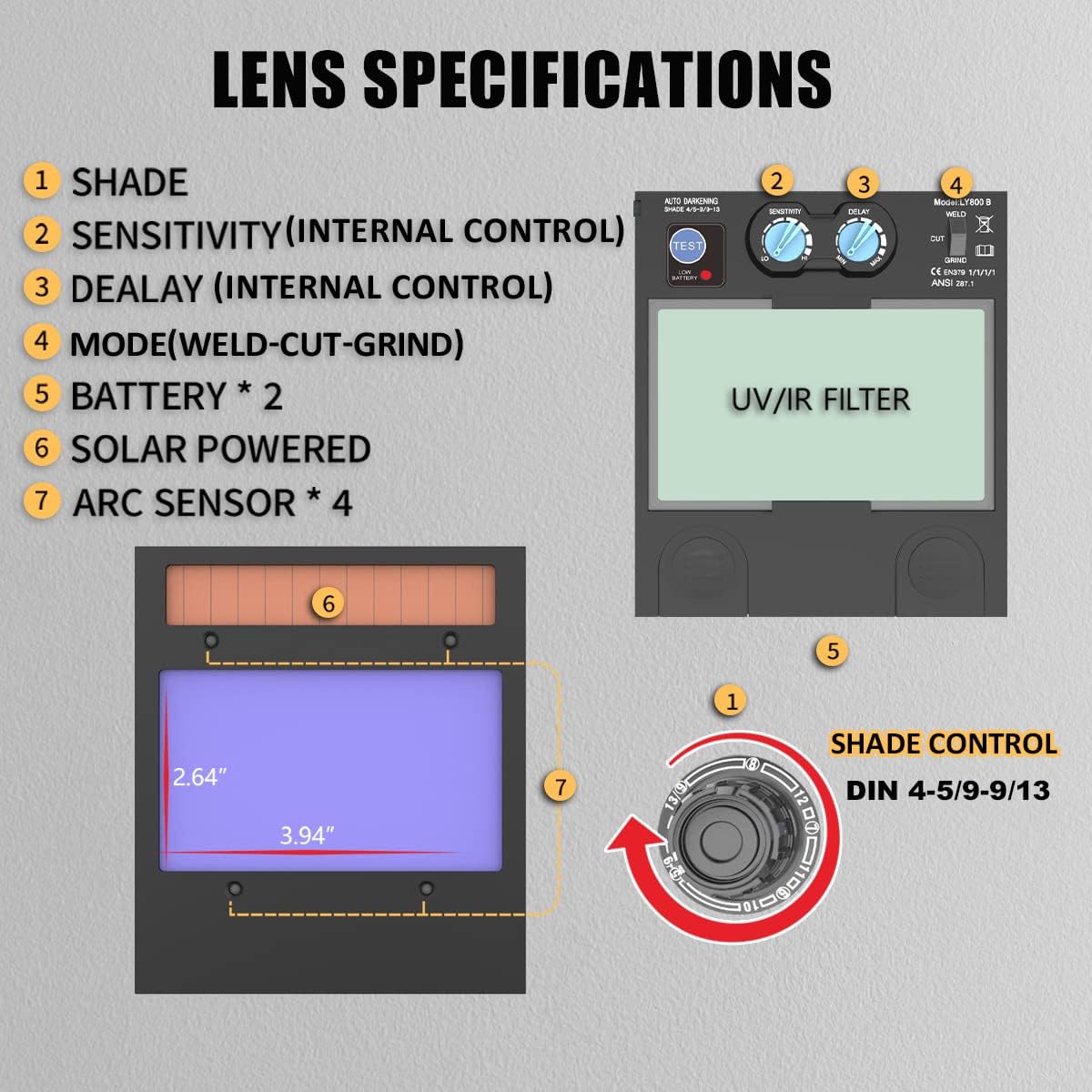 Einstellbare Empfindlichkeit und Verzögerung: Der Schweißhelm verfügt über außenliegende Einstellknöpfe für Verzögerung und Empfindlichkeit. So finden Sie ganz einfach die optimale Einstellung für verschiedene Arbeitssituationen. DIN 4 im hellen Zustand, DIN 5-9/9-13 im dunklen Zustand.