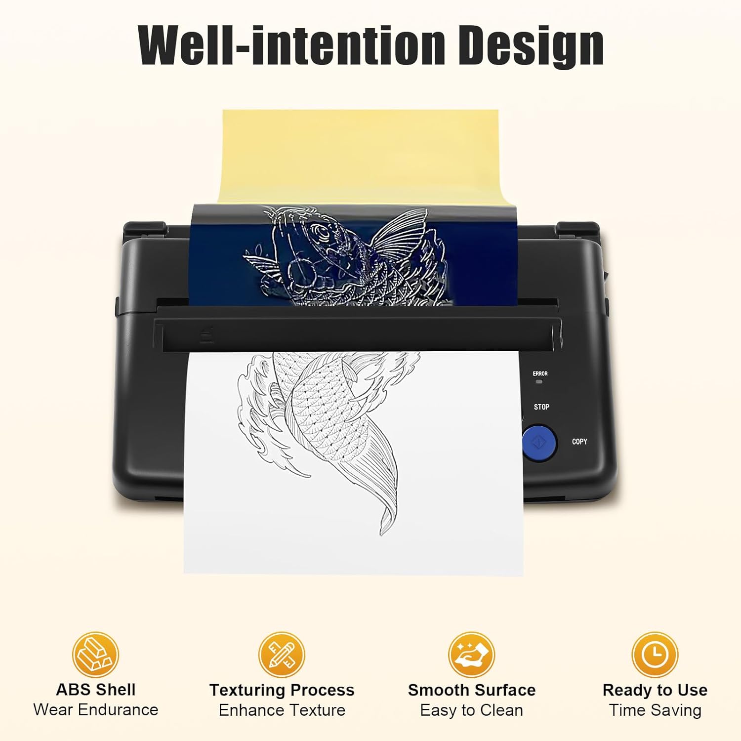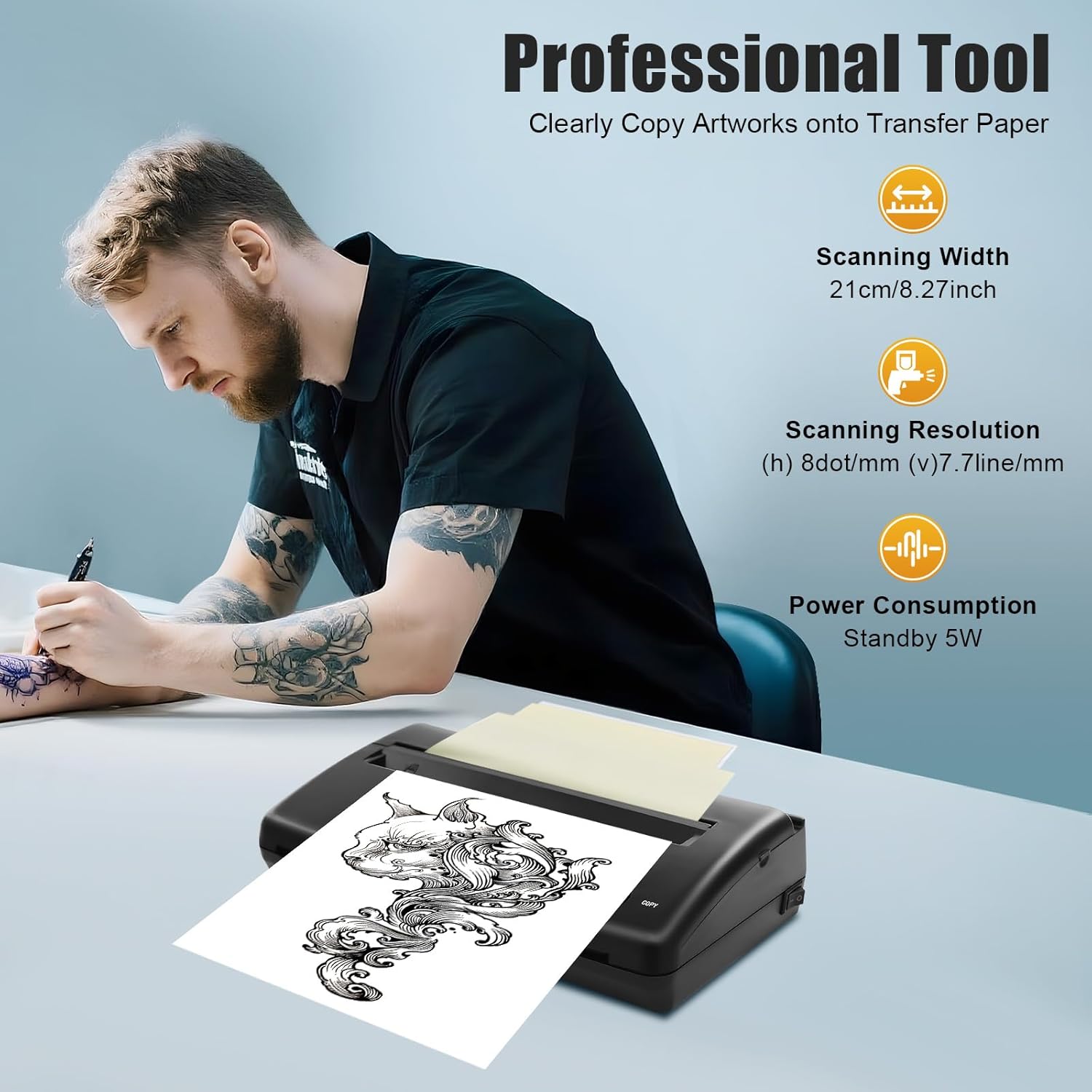 Hochauflösender Thermokopierer Mit einer effektiven Scanbreite von 21 cm (8,27") und hoher Auflösung (8dot/mm), erstellt dieser Tattoo Drucker gestochen scharfe Vorlagen – ideal für präzise Tattoo-Übertragungen.