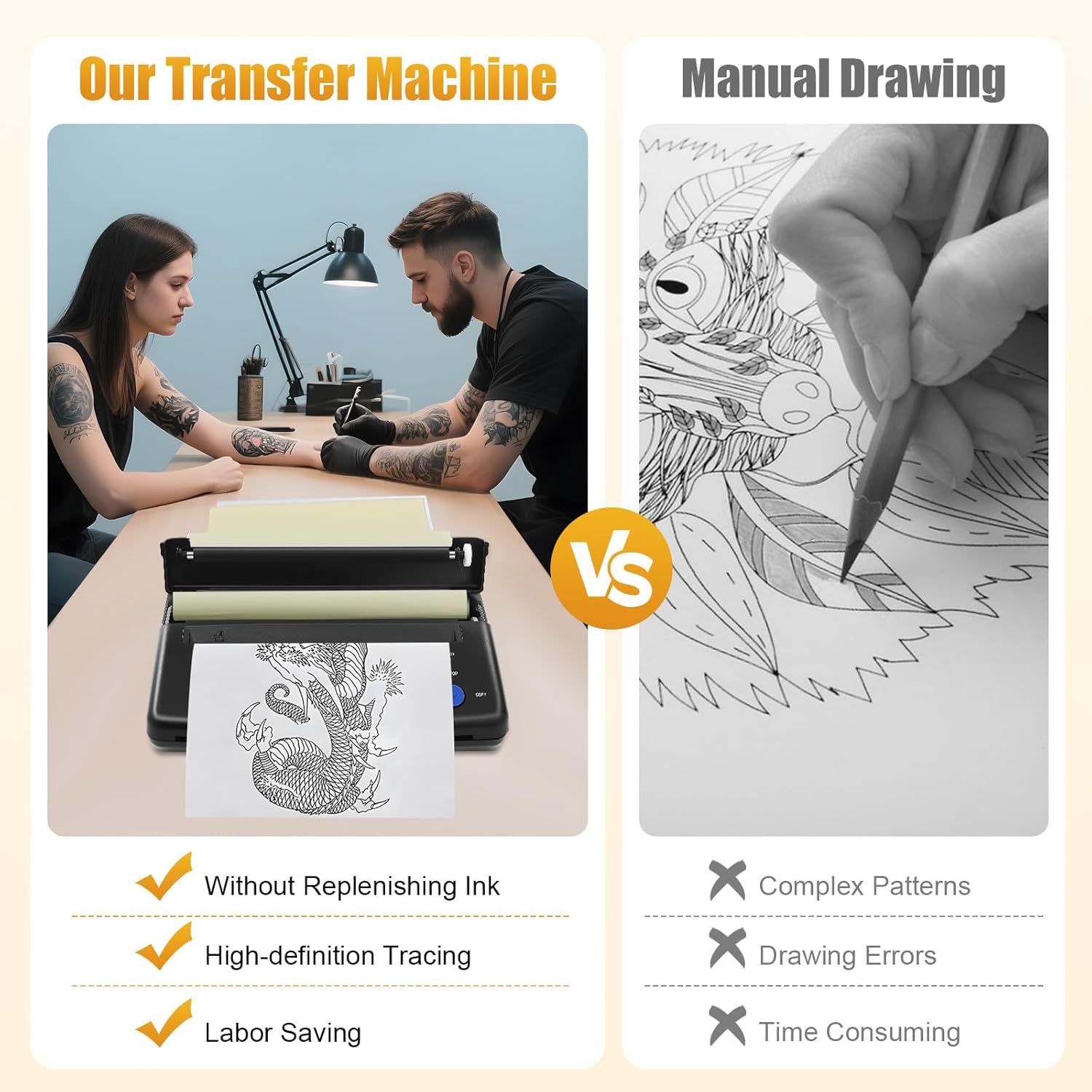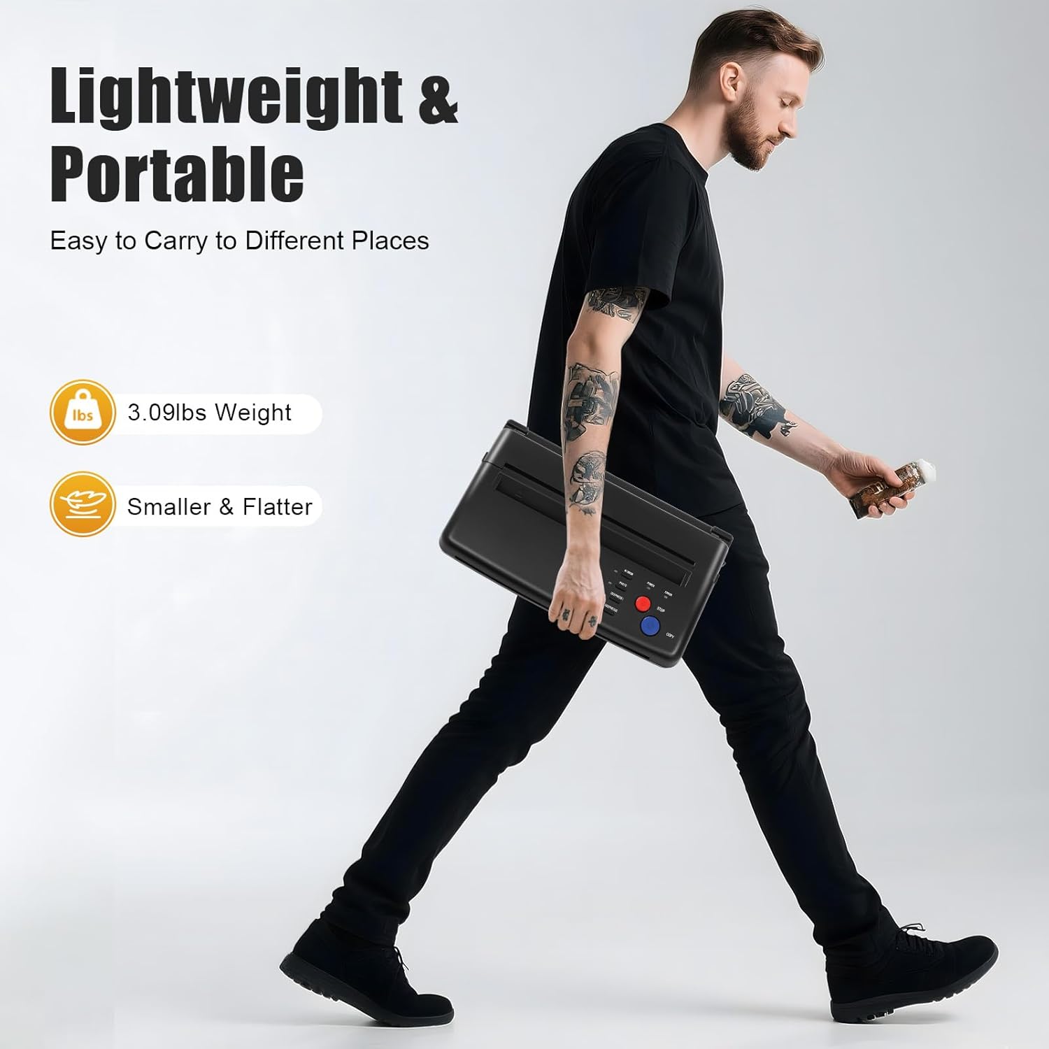 Kompakt & Tragbar Mit nur 1,4 kg Gewicht und einer kompakten Größe (28×16,5×7 cm) ist diese Transfermaschine leicht zu transportieren – perfekt für Tattoo-Studios, Heimgebrauch und Veranstaltungen.