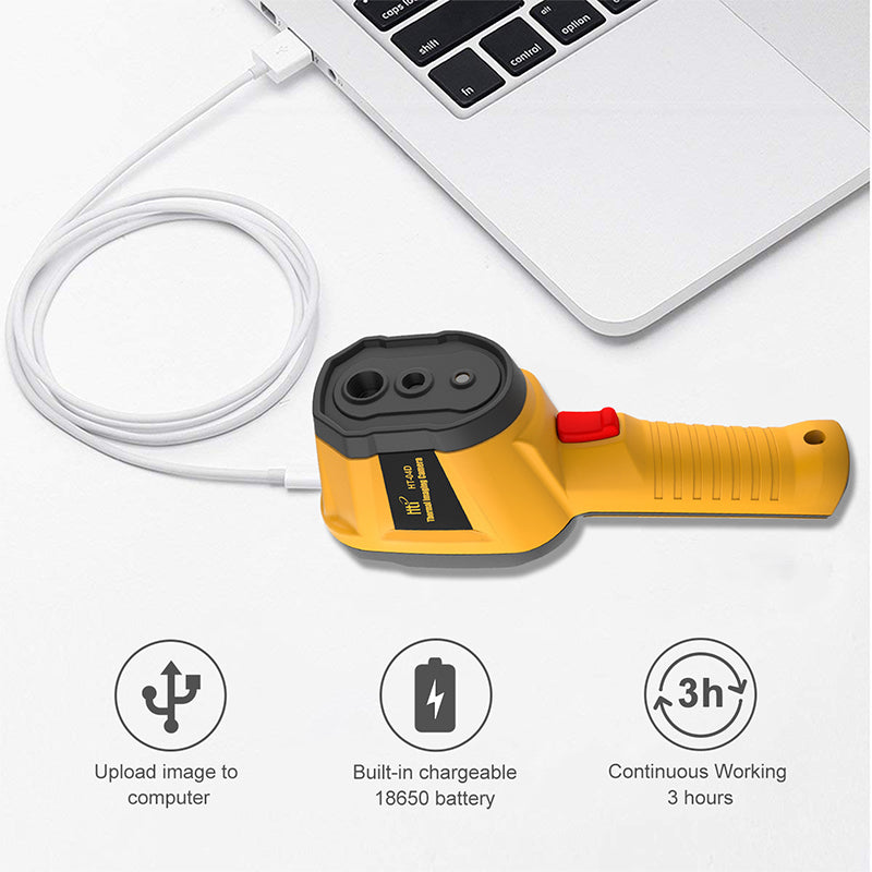 Die Wärmebildkamera HT-04D verfügt über einen 2,8-Zoll-Bildschirm und einen eingebauten Akku, der mit einem USB-Kabel aufgeladen werden kann. Sie hält 2-3 Stunden in Betrieb und die eingebaute LED-Taschenlampe hilft, die Szene bei völliger Dunkelheit zu beleuchten.