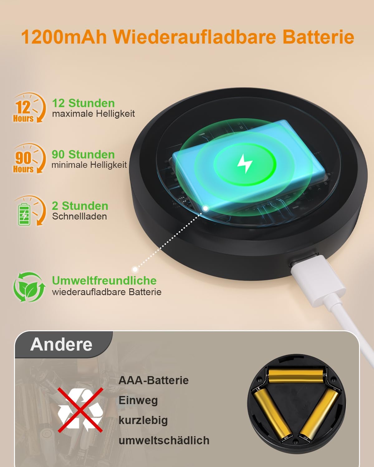 ????[Wiederaufladbar & Energiesparend] Diese schrankbeleuchtung kabellos sind mit einem eingebauten 1200mAh-Akku ausgestattet, sodass keine Einwegbatterien mehr benötigt werden – besser für die Umwelt und Ihren Geldbeutel. Jede wiederaufladbare led spots akku mit fernbedienung hält bis zu 10 Stunden bei maximaler Helligkeit und bis zu 90 Stunden bei minimaler Helligkeit. Mit dem 3-in-1-USB-C-Kabel können Sie drei Leuchten gleichzeitig aufladen, was Ihnen Zeit spart und pro Leuchte bis zu 80 AA-Batterien pro Jahr einspart.