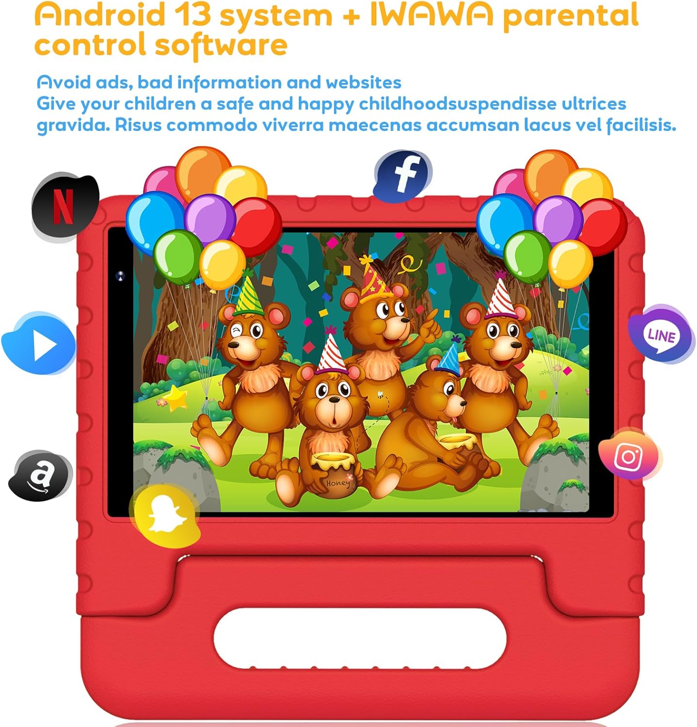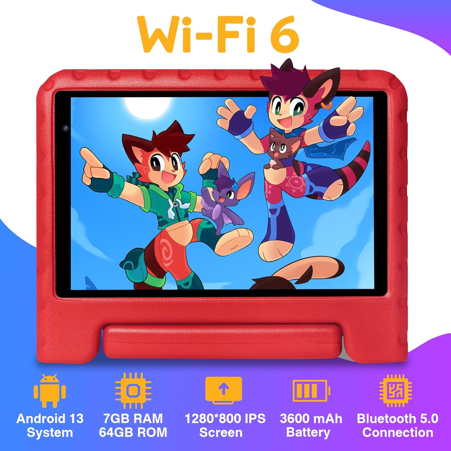 YESTEL 8-Zoll-Tablet mit WiFi 6, Android 13, 7 GB RAM + 64 GB ROM (1 TB TF), HD-IPS-Bildschirm 1280 x 800, Lerntablet für Kinder, Kindersicherung, stoßfestes EVA-Gehäuse, Indigo rot