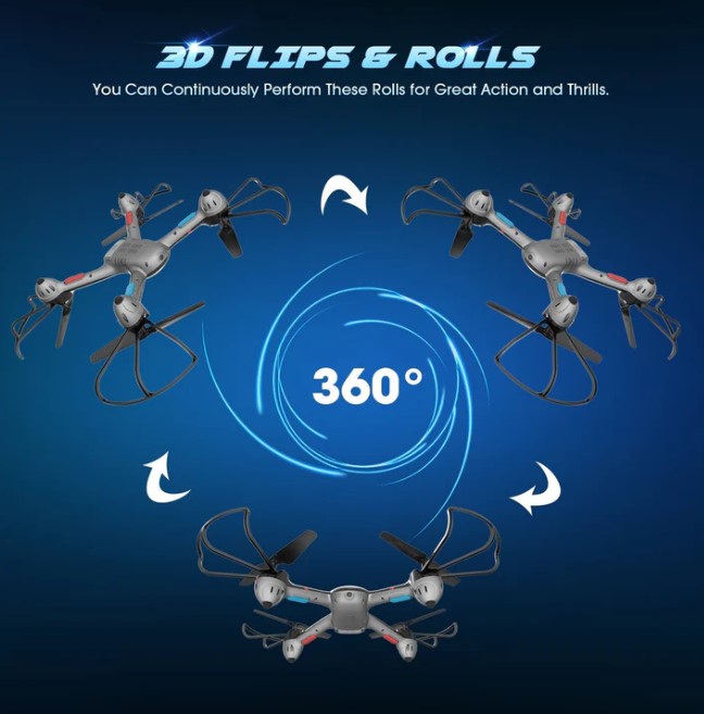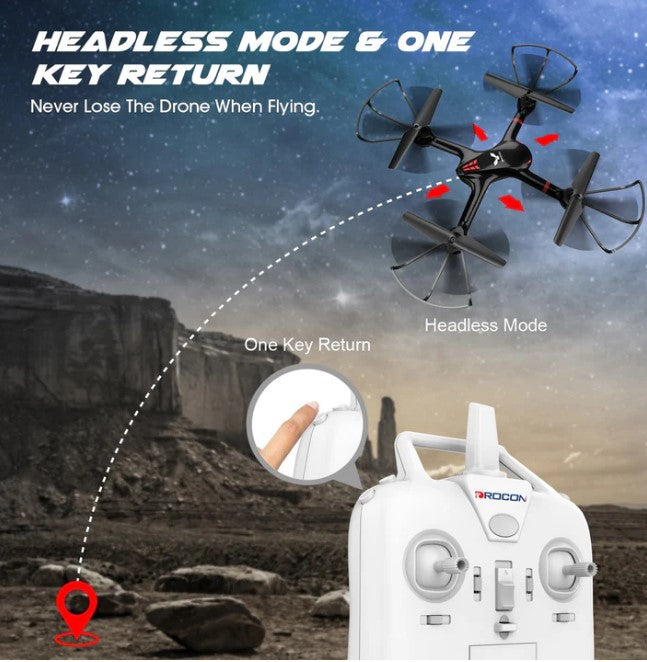 ONE-KEY-RETURN FÜR EINFACHE STEUERUNG: Verlieren Sie Ihre Drohne nie wieder! Wenn die Drohne im Headless-Modus fliegt, drücken Sie die One-Key-Return-Taste, und die Drohne fliegt auf den Spieler zu. Drücken Sie die One-Key-Return-Taste erneut oder bewegen Sie den Vorwärts-/Rückwärts-Steuerknüppel, und die Drohne beendet die One-Key-Return-Funktion.