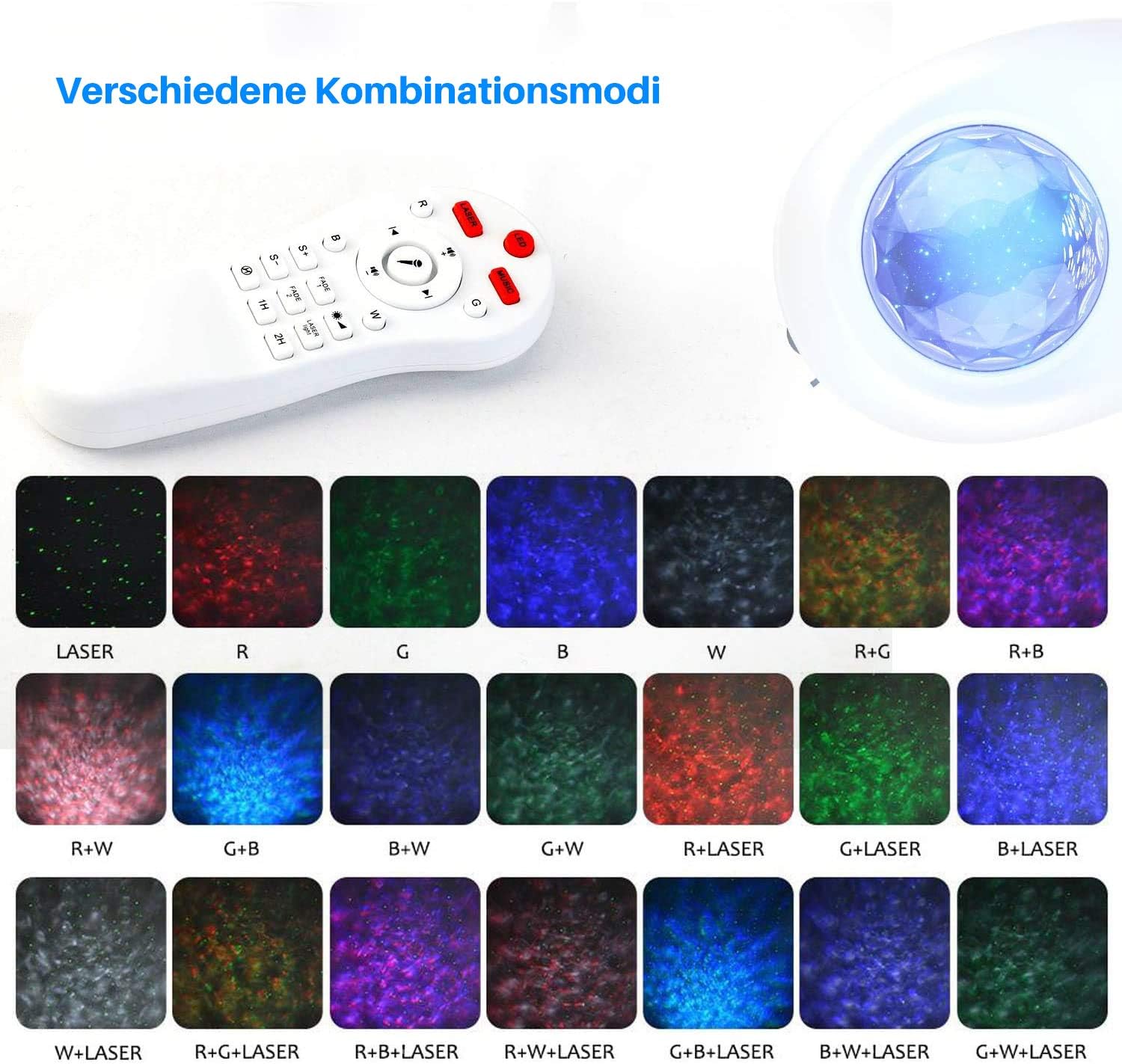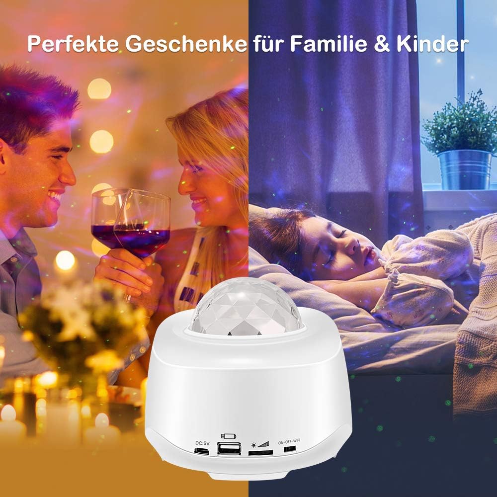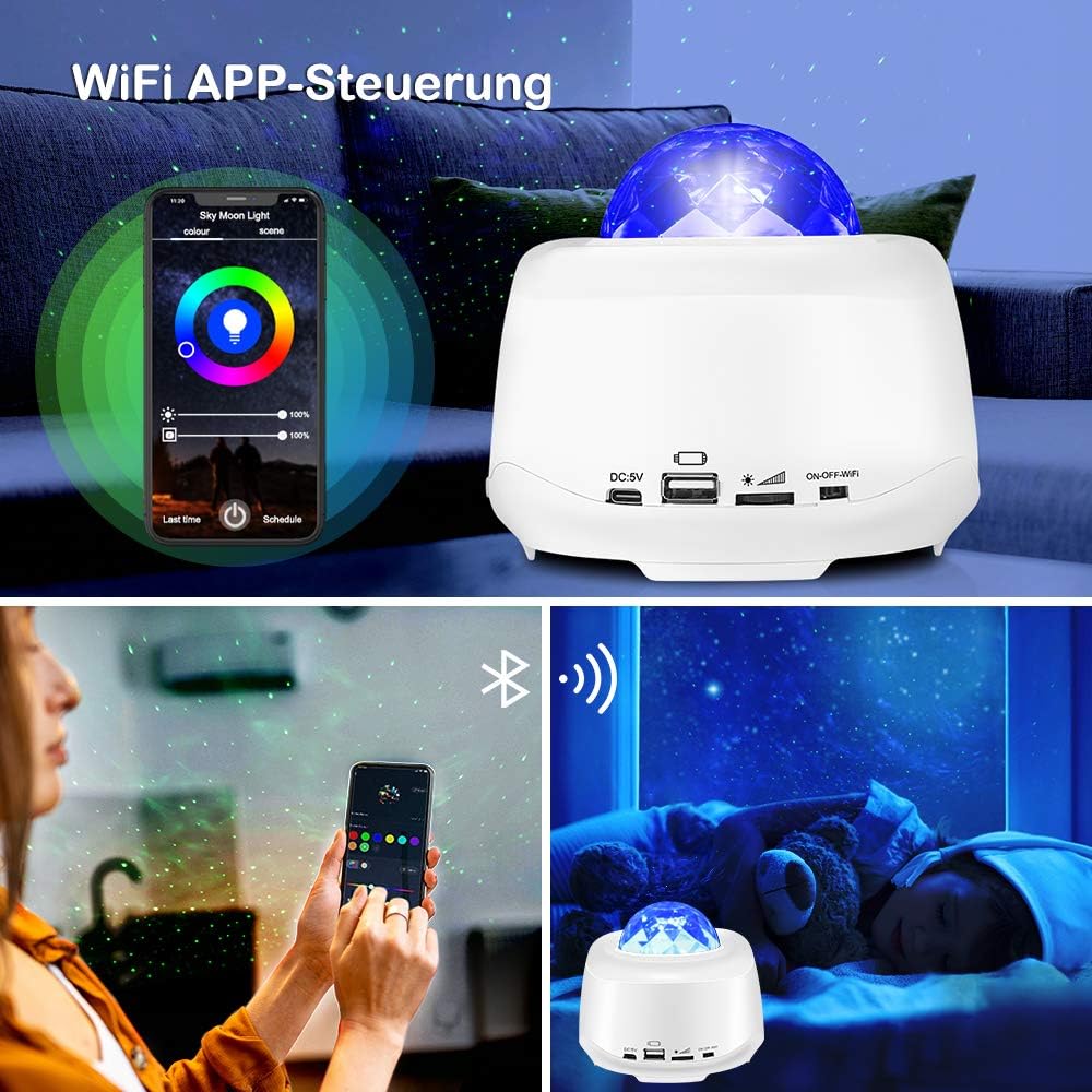 Schalten Sie das Licht frei ein / aus, ändern Sie den Beleuchtungsmodus, wechseln Sie durch Lichteffekte, passen Sie die Helligkeit an, starten / stoppen Sie die Bewegung oder stellen Sie die Lautstärke ein. Mit dem Sound-Bewegungssensor kann die Projektion die Farbe je nach Musikschlag ändern oder in die Hände klatschen, wodurch ein Disco- oder Partyeffekt entsteht. 3 Timer-Optionen für die automatische Abschaltung, integrierte 1H / 2H / Ausschalten.