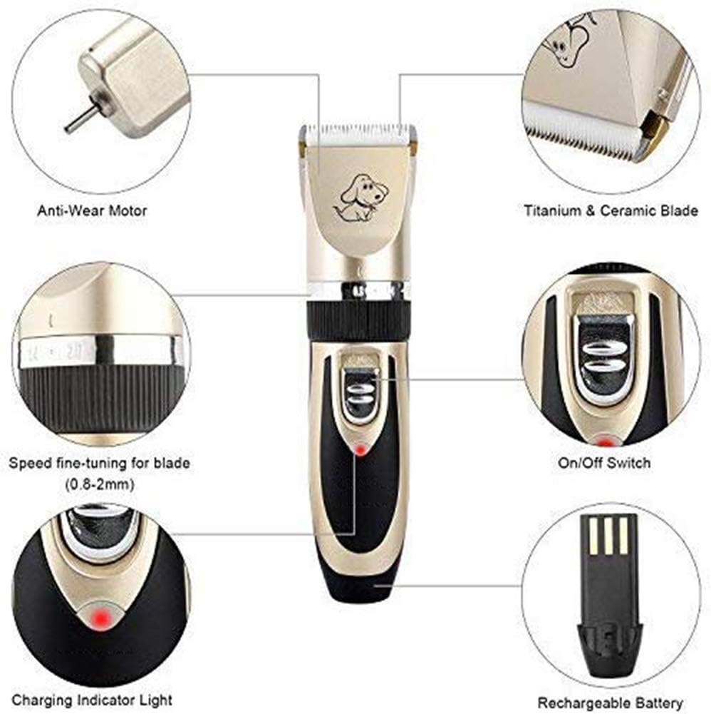 [] Leichtes, kabelloses und kabelloses Design für einfache Nutzung. Das Haustierpflegeset ist mit einem Ladegerät ausgestattet. Bei einer Ladezeit von fünf Stunden kann die Haarschneidemaschine für die Tierpflege eine Nutzungsdauer von 70 Minuten unterstützen. Mit der kabellosen Haarschneidemaschine müssen Sie sich nicht mehr mit dem lästigen Austauschen von Batterien oder lästigen Kabeln herumschlagen. Aber ASLO für Kabel verfügbar.