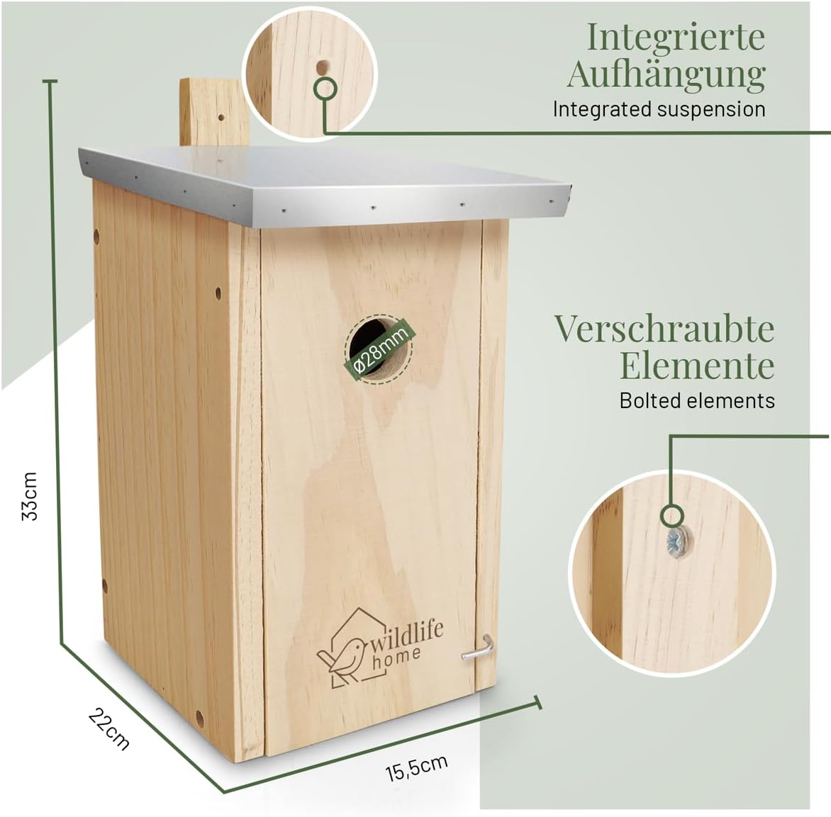 NACH NABU - Belüftungslöcher und Massiv-Holz sorgen für ein gutes Klima im Nest. Die Nisthilfe bietet mit einem großen Innenmaß und einem 28mm Einflugloch ausreichend Platz für kleine Meisen. Maße: 22 x 15,5 x 33cm (LxBxH)